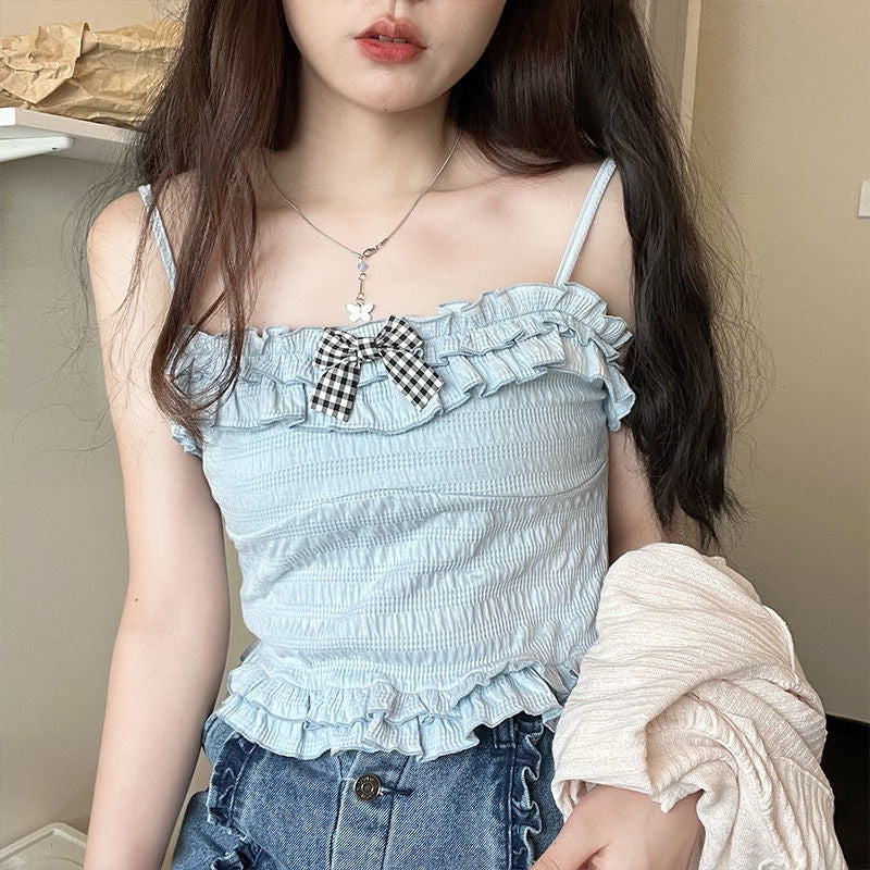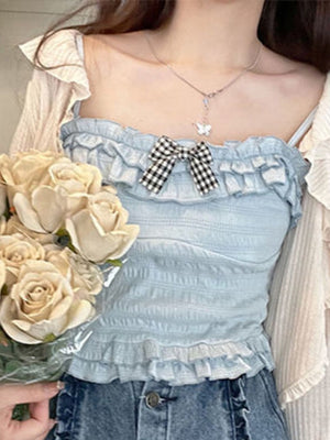 Feel like a fairy in a castle with our Ruched Babydoll Crop Top! This adorable top is made from high-quality textured cotton fabric and adorned with ruffled, plaid ribbons, giving it that angelic touch that’s simply heavenly. Whether you’re going for a soft, dreamy aesthetic or looking to add a little magic to your everyday look, this top is a must-have for your wardrobe! 💖