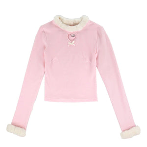 🌸 A cozy long-sleeve turtleneck with a cute heart peephole and fur trim, available in soft pink or pure white. Perfect for staying warm while looking angelic.