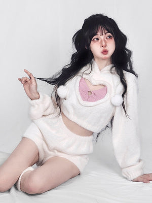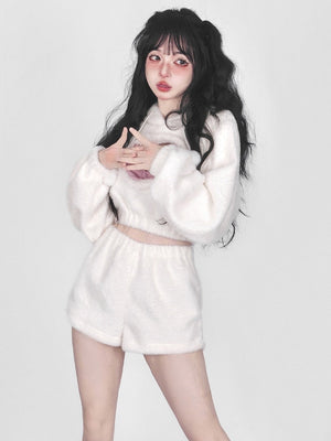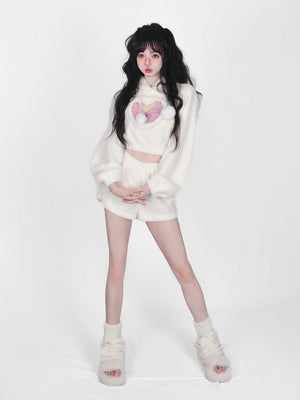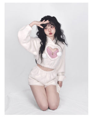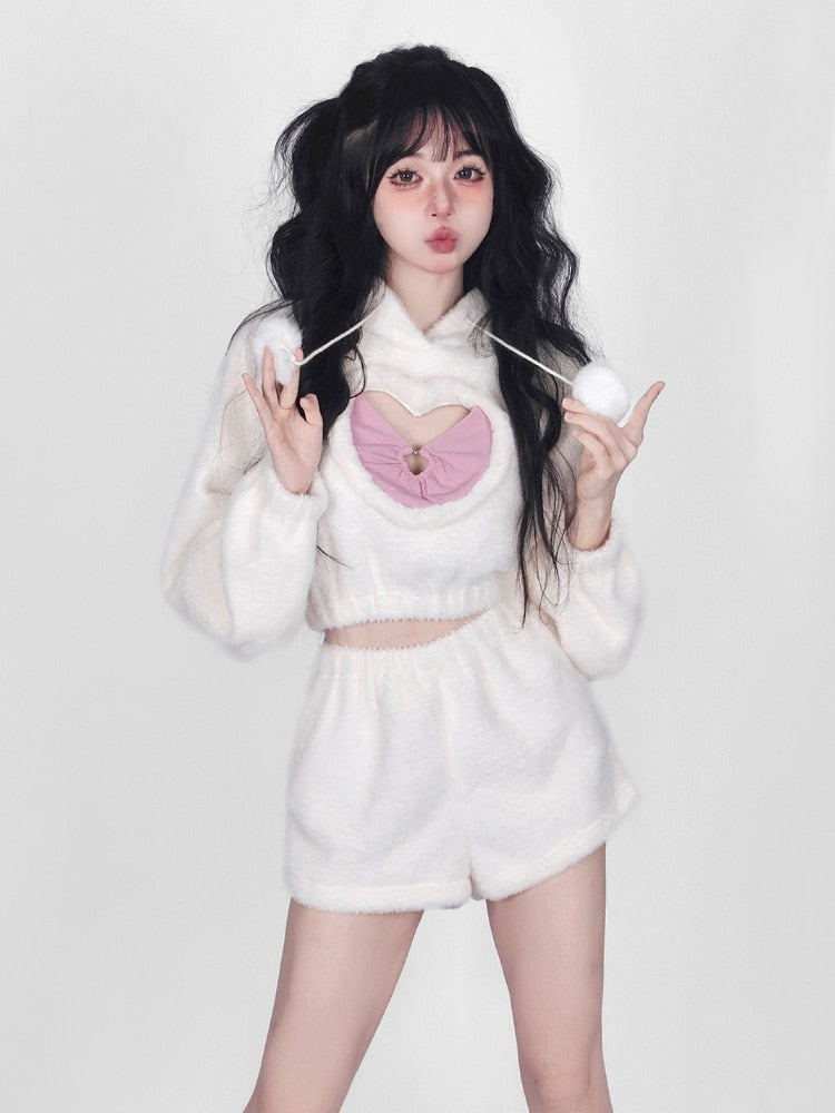 Add a touch of kawaii and dollette charm to your wardrobe with the White Fuzzy Valentine Outfit Set. This adorable set includes a pair of fuzzy white shorts and a matching long-sleeve cropped fuzzy hoodie, both designed to keep you cozy and stylish. The soft and fuzzy fabric feels super comfortable against your skin, while the pink peekaboo heart underlay on the chest adds a playful and cute vibe to the hoodie. 💕