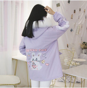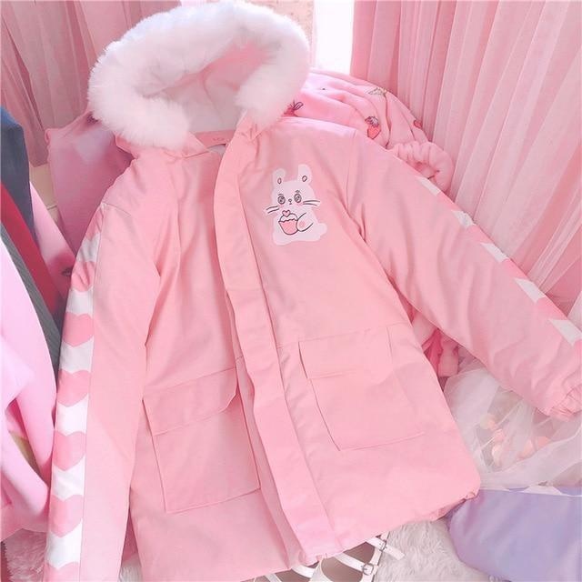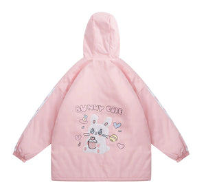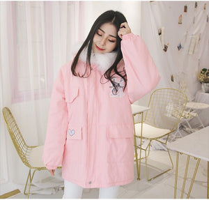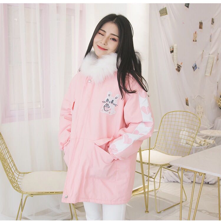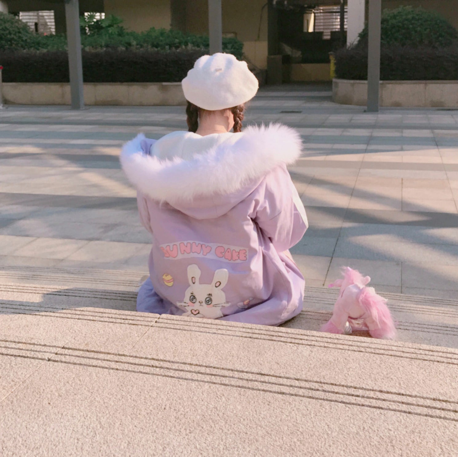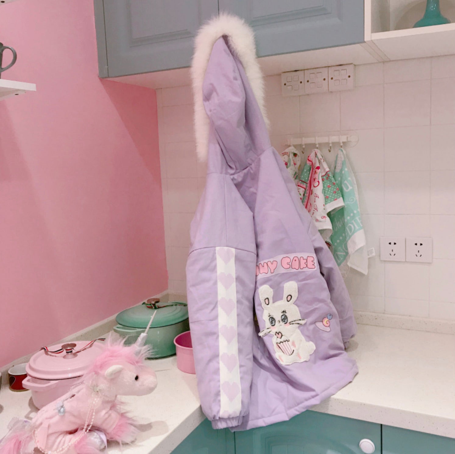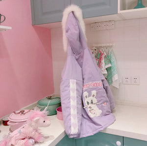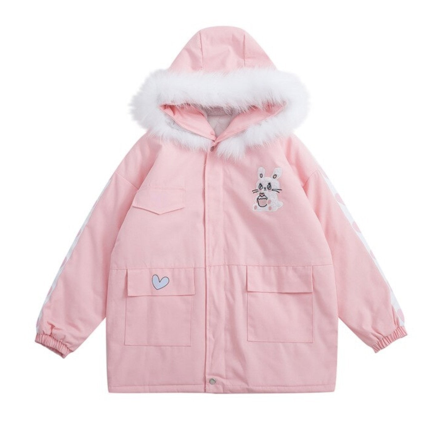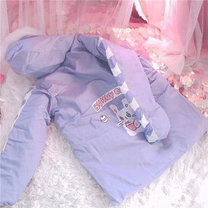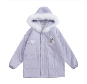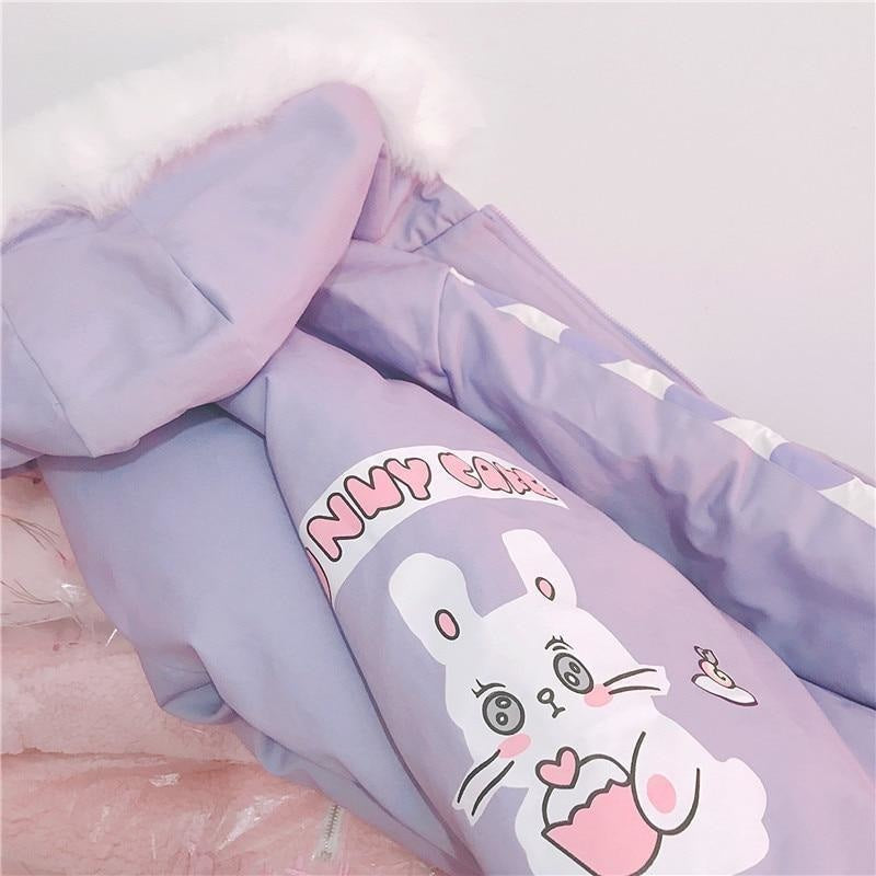 Get ready to face the cold weather in style with our Puffy Bunny Winter Jacket, available in dreamy pastel purple or pink! This jacket is perfect for those frosty days, keeping you warm while looking absolutely adorable. Featuring an all-over heart and bunny pattern, it's a must-have for every Kawaii lover’s winter wardrobe!