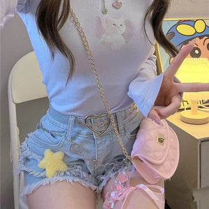 Grab your Frilly Denim Star Shorts and Chain today and make your outfit shine with kawaii flair and Y2K vibes! 🛒💖