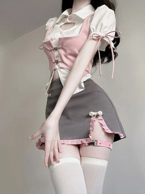 This ultra-sweet 3-piece set includes a soft puff-sleeve white blouse, a pastel pink vest with dainty heart buttons, and a grey skirt trimmed with ruffles and bows. It’s your new go-to outfit for campus strolls, café study dates, or TikTok outfit checks 💅📚