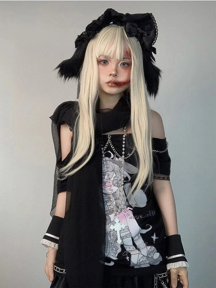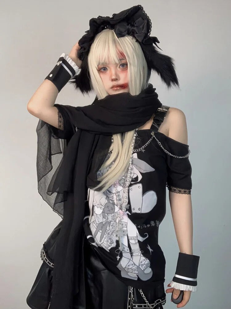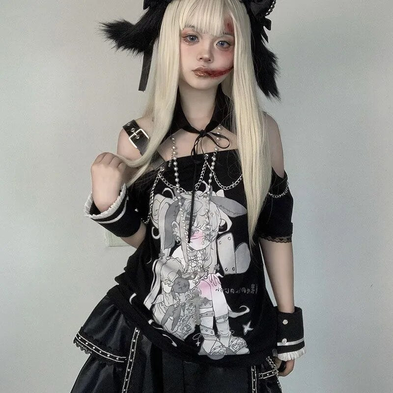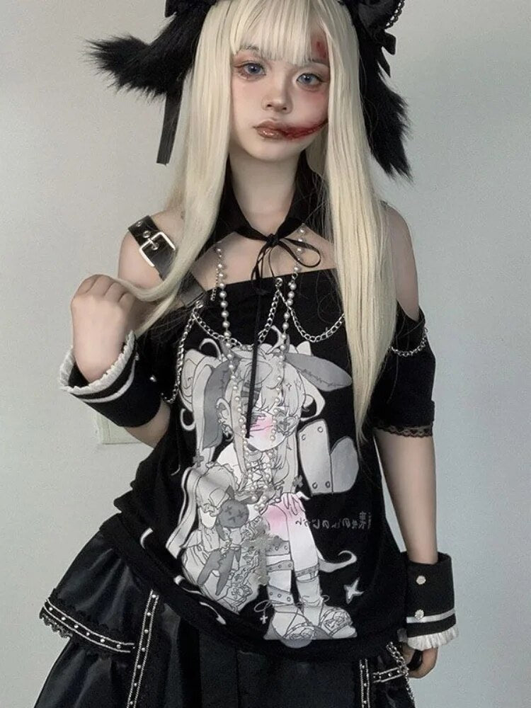 🌸 Pastel Menhera Off The Shoulder Tee 🌸 – Edgy Kawaii Meets Fashion Forward!