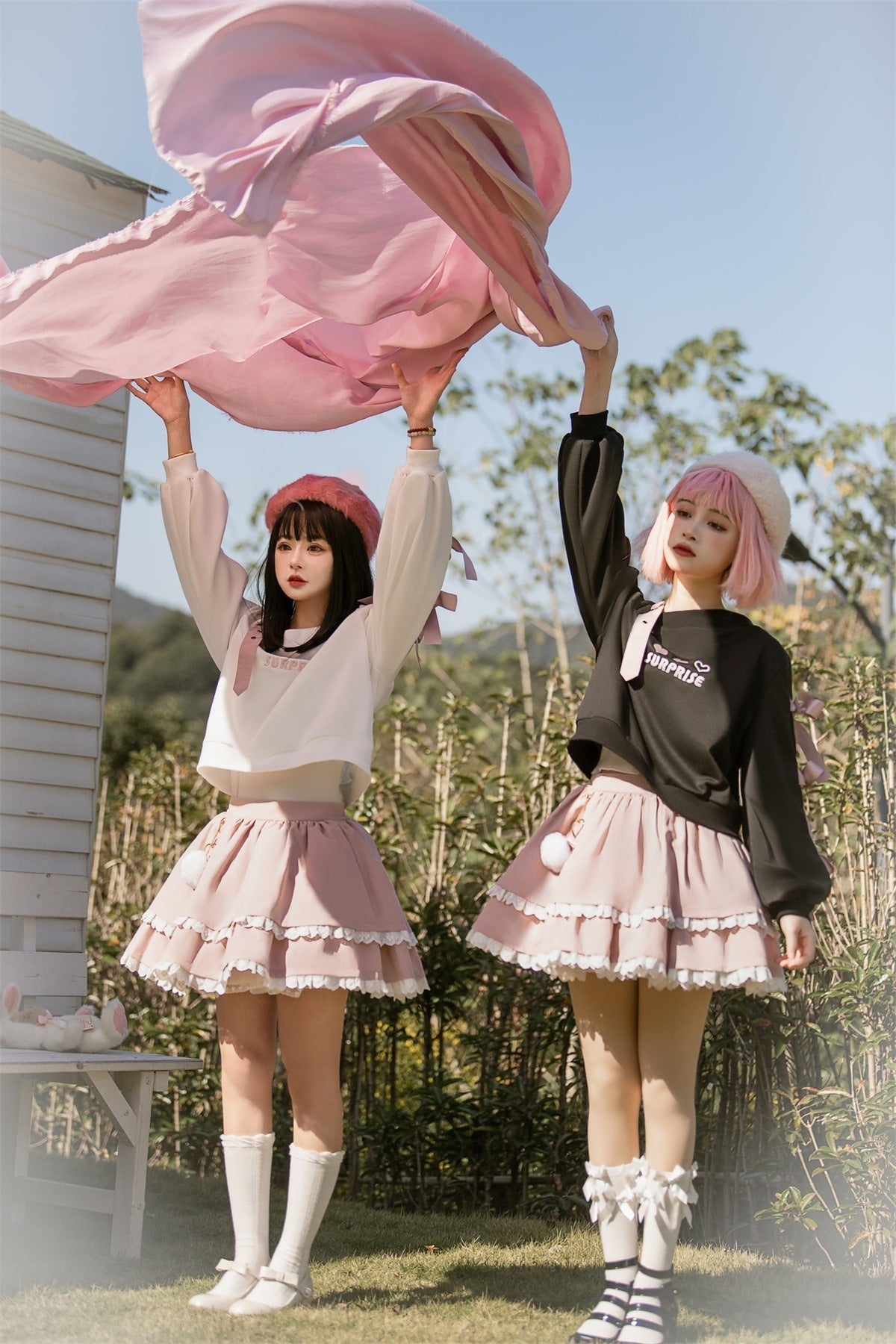 • 🎀 Cake-layered skirt with ruffles and ribbons for a sweet-yet-gothic twist.