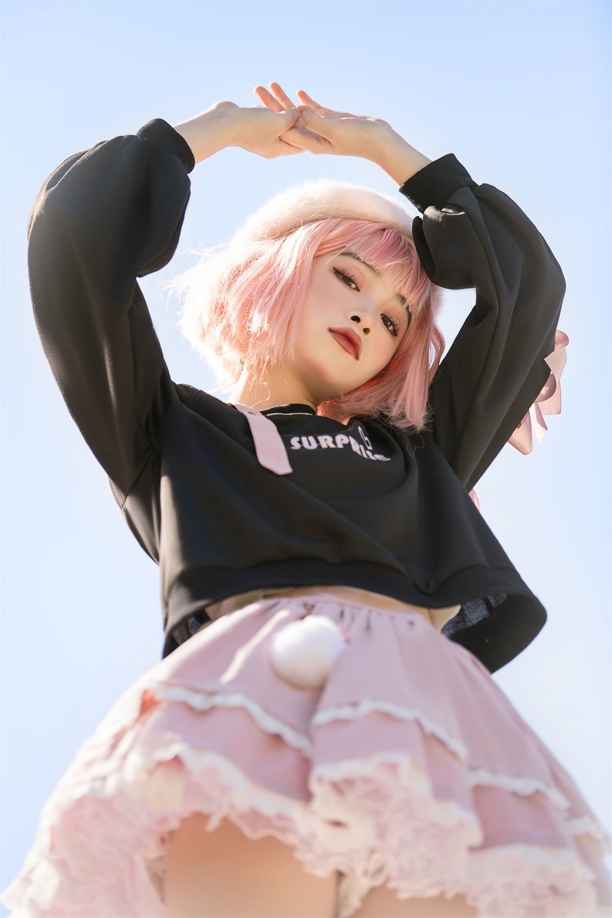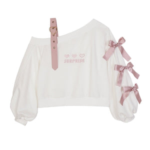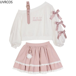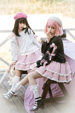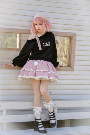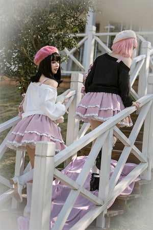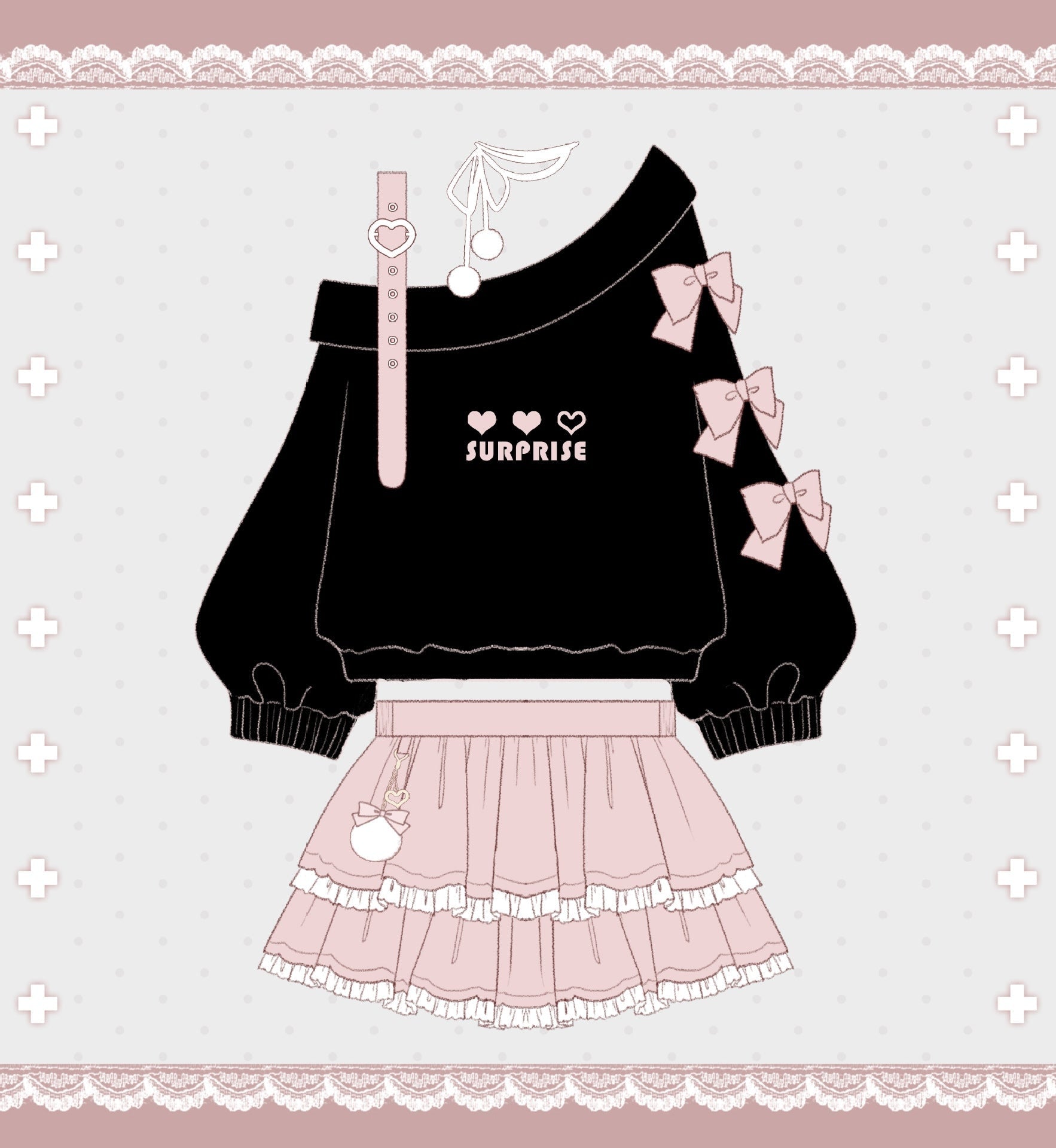 Turn heads wherever you go with this complete Pastel Goth "Surprise" Outfit. Combining the perfect mix of cute and gothic, this outfit is designed to stand out! Start with the heart surprise off-the-shoulder belted top, and pair it with the matching cake-layered skirt for the ultimate pastel goth look. With ruffles, ribbons, and peekaboo cut-outs in all the right places, this set is a total showstopper! 🌙✨