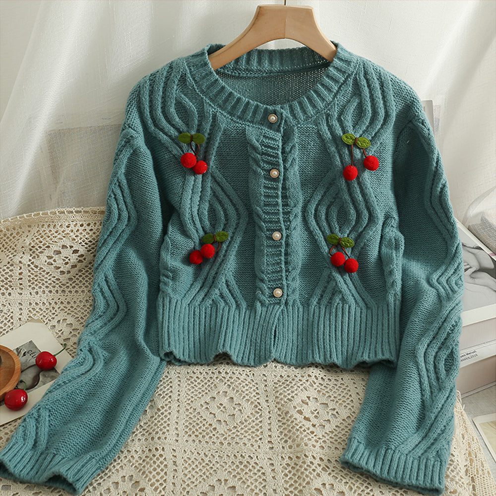 • 🍒 Vibrant and Versatile: Available in multiple playful colors, this cardigan features adorable cherry appliqués that add a fun pop to any outfit.