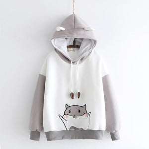 This sweet cat-eared hamster hoodie is a must-have for any kawaii babe with a love for Harajuku and kawaii fashion aesthetics! With adorable little sunflower seeds hanging off the hoodie drawstrings, this hoodie takes cuteness to a whole new level.