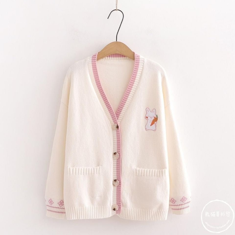 • 🐰 Adorable Bunny Embroidery: Each cardigan showcases a playful bunny and carrot design, adding a charming, whimsical touch to your outfit.