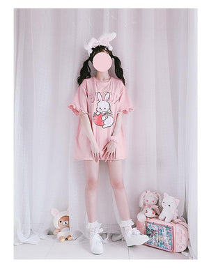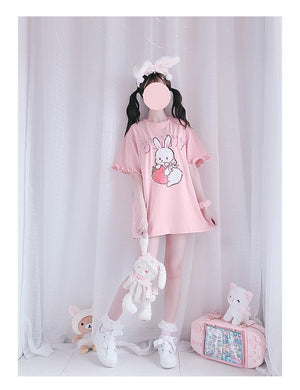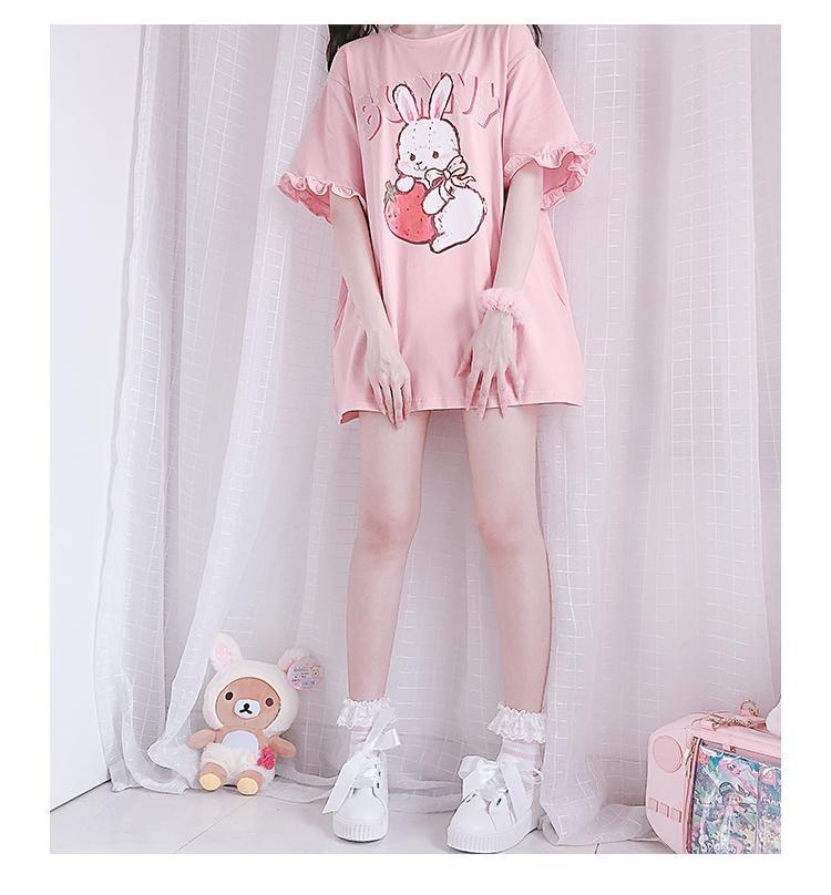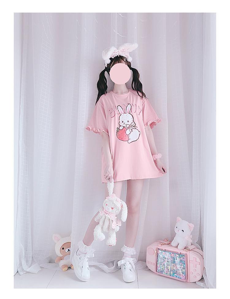 This precious oversized strawberry bunny tee is packed with so many girly details, you'll want to live in this sweet pink top! Featuring ruffle lace trim and a gorgeous Harajuku pink inspired color palette, it's perfect for extra feminine vibes.