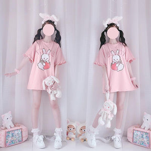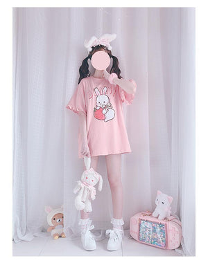 Embrace your inner baby bun with this adorable pink "strawbunny" top, combining comfort and style for a true kawaii look.