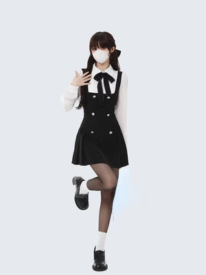 The black dress features elegant buttons and a flattering pleated skirt that flows beautifully as you move. Underneath, a crisp white blouse with puffed sleeves adds softness and contrast. To top it all off, a chic black bow tie ties the whole look together with that iconic scholarly flair. The tailored fit accentuates your waist while keeping everything comfy and easy to wear.