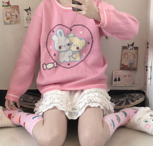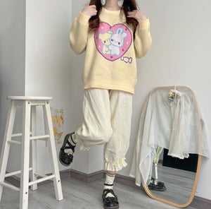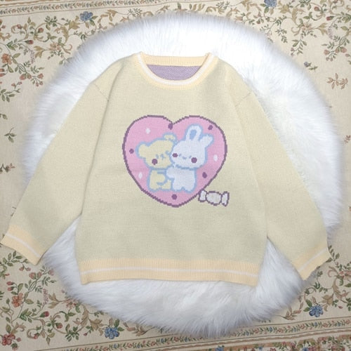 This Fairy Kei Pink & Yellow Bunny Knit Pullover Sweater is an absolute must-have for every kawaii babe who adores bunnies and pastel fashion! Featuring the sweetest little bunnies snuggling together, this cozy pullover is perfect for adding a touch of cute magic to your wardrobe. With its soft knit material, ribbed cuffs, and milky pastel colors, you'll feel extra adorable and comfy every time you wear it. 💕